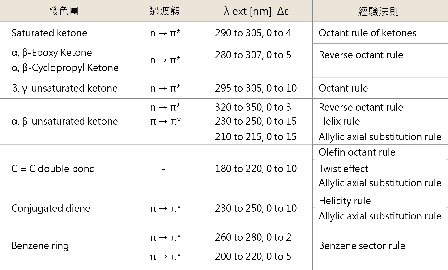 三維環境對發色團(Chromophore)周圍產生的科頓效應已得到廣泛研究,主要發色團的經驗規則列於表2中。
