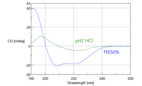 根據CD光譜,可以估計蛋白質的基本結構,以及α-螺旋(α-helices)、β-折疊(β-sheets)和隨機捲曲的組成比例。圖11展示了Concanavalin A的CD光譜。在自然狀態下,它具有豐富的β-折疊結構,但通過氟乙醇(Fluoroethanol, TFE)可以轉化為豐富的α-螺旋結構。圖中顯示了pH值為2的鹽酸溶液中的Concanavalin A和50% TFE溶液的光譜圖,分別指示了β-折疊和α-螺旋。