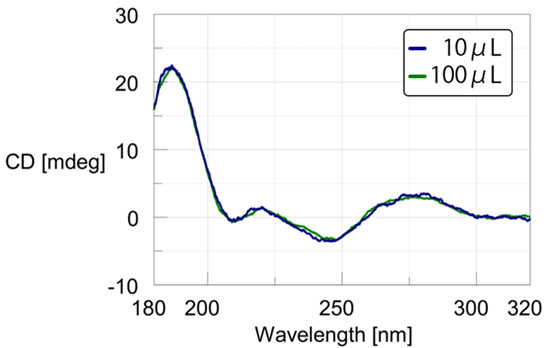 進行CD測量時,如果使用1 mm的光路長槽座,需要約400 μL的樣品體積。然而,對於非常珍貴的樣品,可以使用微型取樣盤來測量更小的量。只需將樣品滴在已組裝的盤中心的防水塗層區域即可簡單地測量CD光譜(見圖13)。可測量的體積範圍為2 μL(光路長0.2 mm)至10 μL(光路長1 mm)。圖14顯示了牛胸腺(Bovine Thymus)DNA溶液10 μL滴量和常規400 μL圓柱細胞(Cylindrical Cell)樣品的結果。可以看到,盡管樣品大小相差40倍,但CD光譜幾乎相同。