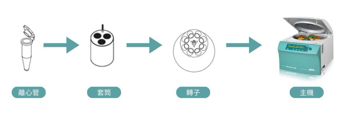 套筒(Adaptor):可固定及支撐容器,避免容器與轉子口徑有差異時,在高速旋轉離心下破裂飛散。