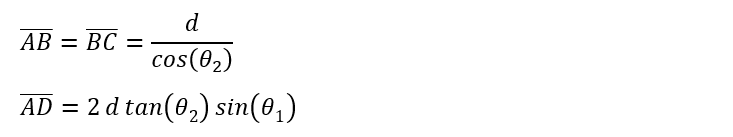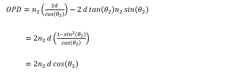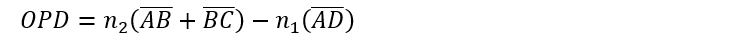 由於入射到薄膜上的光會經由上層和下層邊界反射,因此可以計算反射光的光程差(optical path difference, OPD)來知道干涉條件。參考圖一的光線圖,兩個波之間的OPD如下: