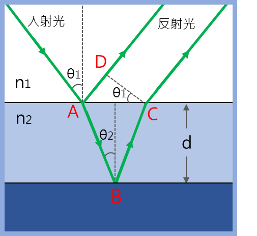 圖一、入射光從薄膜的上層和下層邊界反射光的光程長度差異。