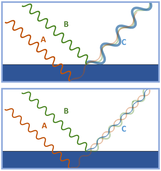 如圖二中顯示了兩道入射光束A(橘色)和B(綠色),照射到薄膜時,各自產生一道反射光束(淡橘色與淡綠色),這些反射光束最後組合產生新的光束C (藍色)。如上圖所示,如果反射光束具有一樣相位(phase),則產生的光束C相對較強。如下圖所示,如果反射光束具有相反的相位,則產生的光束C會衰減。